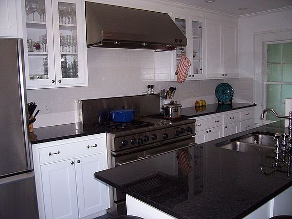 Kitchen renovation includes beautiful black granite countertops and custom-built cabinets and new tile flooring.
