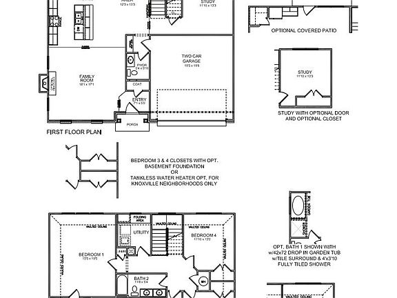 The Greenfield offers a great first floor layout with a large family room opening to a spacious island kitchen and breakfast area. The kitchen features an island design with countertop dining and a corner pantry. The first floor includes a coat closet and full bath, conveniently located off the entry hall, as well as a study or optional bedroom at the rear of the home. Upstairs are the primary suite and three additional bedrooms, all with vaulted ceilings. The primary suite includes a large walk-in closet, luxurious bath with double bowl vanity, tiled shower, and garden tub. The hall bath features a spacious double bowl vanity. A separate utility room with folding counter is conveniently located on the second floor.