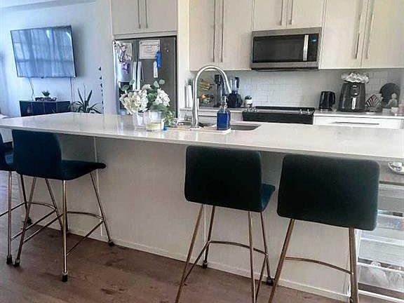 Modern livingOpen-concept main floorBright living dining areaCentrally located kitchenLarge kitchen islandElegant quartz countertopsStainless steel appliances