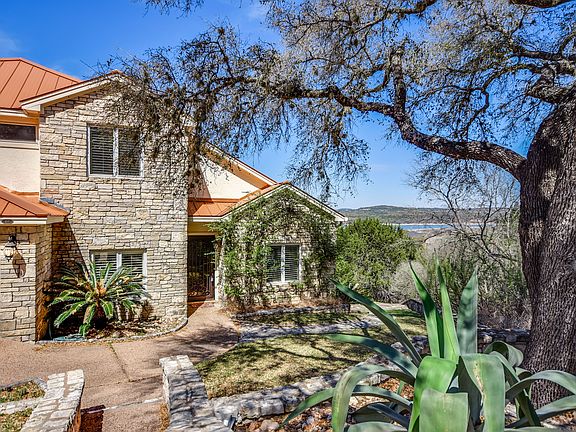 Lake Travis Waterfront Home. 143' of MAIN CHANNEL, DEEP frontage. Spacious 3-level home w/ Master Suite on Main Level & HUGE Great Rm/Kitchen/Dining + Office. Upper Level has 3 Bedrooms + Bonus/Game/Media room currently used as Bunk Room. Lower Level is an AMAZING Game Room+another Guest Bedroom w/adjacent Bath. *Seller will consider conveying Game Tables & Furnishings in the Home* Stone path/steps lead to Cabana & Private 2 Slip Boat Dock w/Jet Ski Lifts. PANORAMIC Views.