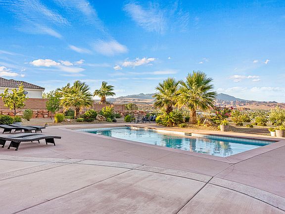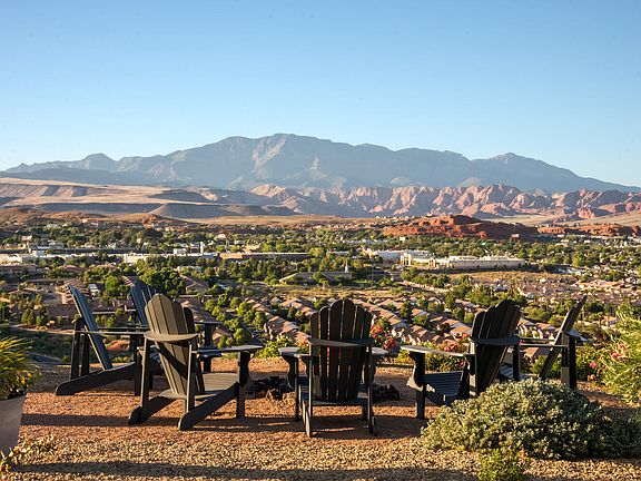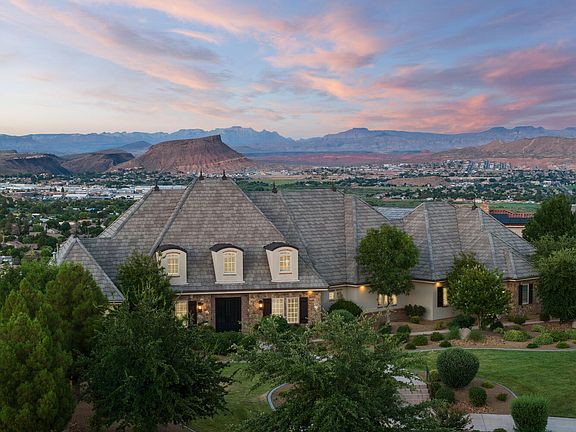 Located in the heart and atop of St George, 217 S Crestline Dr. is situated on a spacious 1.28 acres. First impressions will be met with the outstanding curb appeal from the meticulous landscape, to the pull through driveway and terraced pathway approach. This exquisite home features just under 6,000 square feet of living space, with architecture and design inspired by its breathtaking surroundings, ensuring that every room captures a view. This home features four en-suite bedrooms, and two additional half bathrooms. A spacious office, adorned with custom built-ins and a closet, offers the versatility to serve as a fifth bedroom, perfect for accommodating guests or transforming into a creative workspace. The formal dining room is a showcase of elegance, featuring a coffered ceiling and butler's pantry, ideal for hosting formal dinners and gatherings. Adjacent to the dining room, a living room that is the true centerpiece of the home, boasting expansive windows that frame panoramic views and flood the space with natural light. A cozy fireplace anchors the room, creating a warm and inviting atmosphere for relaxing evenings or entertaining guests. The large kitchen is a culinary dream, equipped with top-of-the-line appliances, ample counter space, and a large hidden pantry, perfect for all your storage needs. The kitchenette dining area, perfect for casual meals, seamlessly opens to the great room. This space is highlighted by stunning views and a second fireplace, making it an ideal spot for family gatherings and social events. The thoughtful design ensures that whether you're preparing a meal, dining, or lounging, you can always enjoy the breathtaking views that define this remarkable property. The primary bedroom is nothing less than elegant, capturing some of the best views southern Utah has to offer. A beautifully designed and spacious en-suite opens to a double closet with ample built in storage including an additional flexible space suited perfectly for a small gym or hobby room. Upstairs hosts 3 bedrooms each with an en-suite. Guests will appreciate the 2nd laundry, half bath & spacious living area with 85" tv, surround sound & dry bar. Expansive views included in this space as well. In 2022, the property was enhanced with the addition of a spacious 20 x 50 detached RV garage with a 14 x 14 door, complete with an EV charging station. These features provide ample space for an RV, boat, or off-road toys, even a classic car collection and the solar panels contribute to energy efficiency and sustainability. The backyard is an entertainer's dream, impeccably landscaped with no shortage of breathtaking views. Enjoy the built-in barbecue, two covered patios with an outdoor fireplace, surround sound, and a crystal blue pool. A cozy gas fire pit overlooks the edge of the property, creating an idyllic setting for relaxation and enjoyment. There's even plenty of room to add a private pickleball court, enhancing your outdoor recreation options.