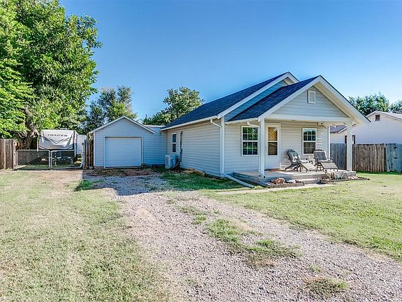 This is an adorable 1 bed, 1 bath home WITH an office or 2nd bedroom flex space! Sitting on a quarter of an acre, you will enjoy your own private park setting in the backyard with a nice big deck, fire pit area, big trees and lots of room to play! The house has RV parking with an electrical hookup, so this is the perfect house if you love to travel and just need a place to land between trips, or you have family and friends that love to come visit! The interior is super cute with nice wood laminate flooring and fresh paint, giving it a light, bright and airy feel! The bedroom has a beautiful wood accent feature wall and a walk-in closet, which can double as another office space. The kitchen is a comfortable place to be with dreamy aqua cabinets, nice laminate countertops, bright LED under cabinet lighting and pretty wood display shelves. And there is a big pantry for stocking up. The flex room would make a great office or craft room, or a perfect little kids room, like it's being used for now! There is a one-car garage for additional storage or parking and a long driveway for plenty of parking space. Updates in the last year include: new storm shelter added, new whole home instant water heater, new touch faucet in kitchen, new glass top optional dual oven with air frying capability, freshly painted and new flooring in the kids room.