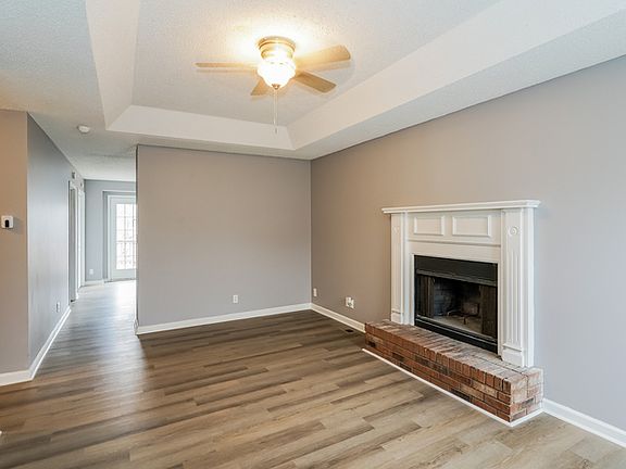 Inside, the living room opens with soft-toned walls, durable LVP flooring, and a statement centerpiece that anchors the space. The kitchen features sleek white cabinetry, marble-style countertops, stainless steel appliances, and a breakfast bar that connects seamlessly to the dining area, perfect for easy conversation and flow.