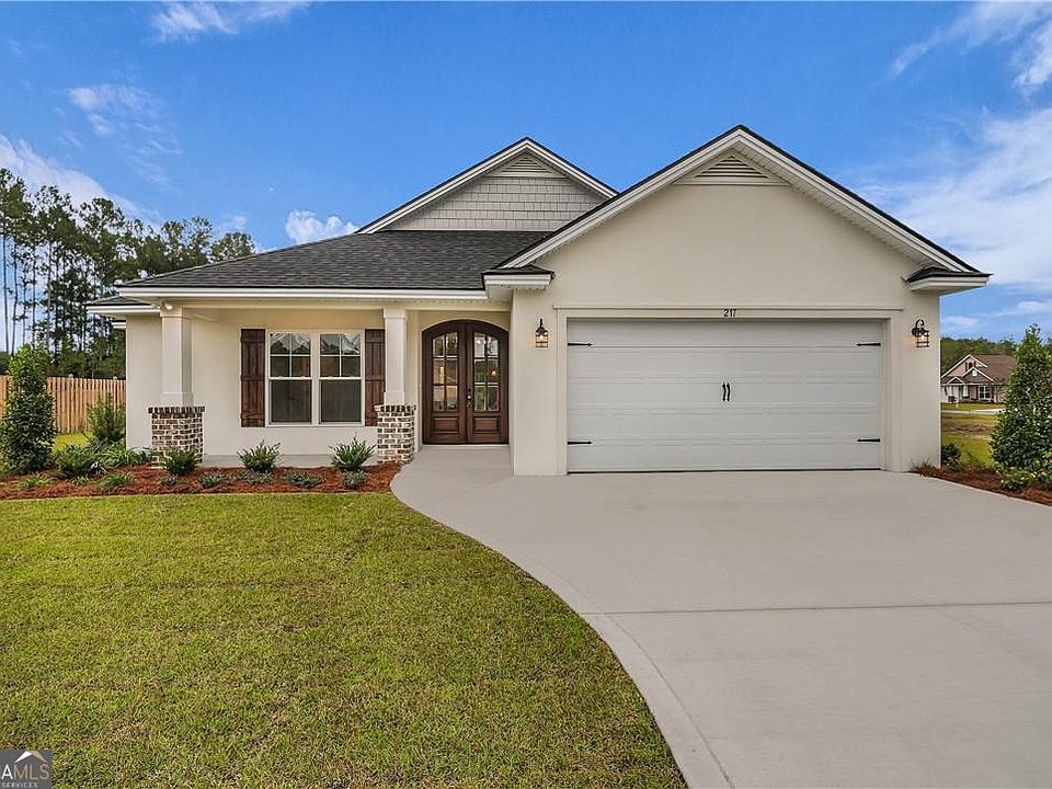 This beautiful 3 bedroom, 2 bathroom home with a double garage is located in Sweetwater at Golden Isles Subdivision. It is being built by Driggers Homes and includes custom cabinets in the bathrooms, laundry room, and kitchen. Other interior features include solid surface countertops in the kitchen and bathrooms, a walk-in closet at the main bedroom and guest bedrooms, and dual sinks in the main bathroom. The main bathroom will also have a tile shower with glass enclosure and a separate garden tub with tile surround. There will be LED lighting in the great room and main bedroom. This home includes covered front and back porches with a grilling pad. The exterior of the house will be stucco and cement siding with masonry column bases at front porch columns. There will be ceiling fans in the bedrooms, great room, and on the back porch. There will be 10 foot ceilings at the foyer and great room with 9 foot ceilings throughout the rest of the house. This house includes 30 year architectural shingles.