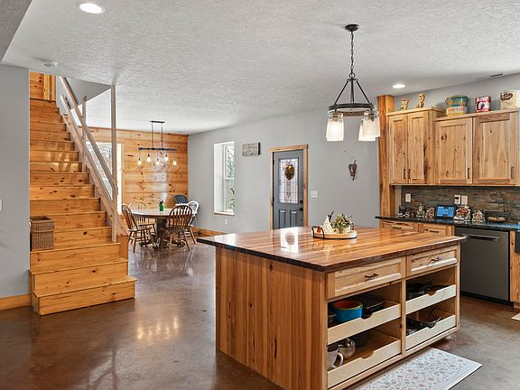 Discover exceptional country living on 20+/- acres in Webster County with this custom-built shouse offering the perfect blend of comfort, craftsmanship, and functionality. With approximately 3,500 sq ft of living space plus an impressive 45x45 heated attached shop/garage--complete with oversized overhead doors--this property is ideal for hobbyists, entrepreneurs, or anyone craving room to work and play.Inside, the open-concept kitchen and dining area features custom wood cabinetry, a built-in desk for home-office needs, an oversized butcher-block island, and a commercial-grade upright refrigerator and freezer--all included. A massive walk-in pantry sits just down the hall, offering abundant storage and prep space.The inviting living room showcases a vaulted ceiling and warm wood accents, creating a perfect setting for both relaxing evenings and entertaining guests. The main-floor primary suite feels like a retreat, offering a luxurious soaking tub and an oversized walk-in shower.Upstairs, the home continues to impress with three spacious bedrooms, a full bathroom, a second living area, and an additional office/storage room that could serve as a non-conforming bedroom.Comfort is assured year-round with wood-fired radiant floor heating and central air conditioning.Outdoors, the covered back patio overlooks beautiful wooded acreage filled with mature trees, offering not only privacy but excellent hunting opportunities. The owner has harvested quality deer and turkey, making this a standout property for outdoor enthusiasts.Though the property carries a Niangua address, it is located within the Conway school district.A shared driveway easement will be included for access to the adjoining land.This rare property provides privacy, space, convenience, and exceptional outdoor recreation--all in one spectacular setting.