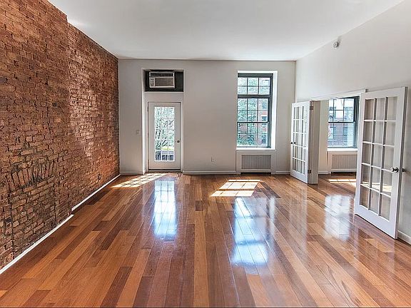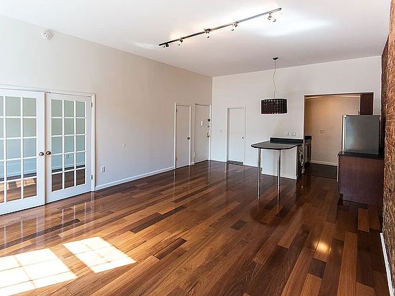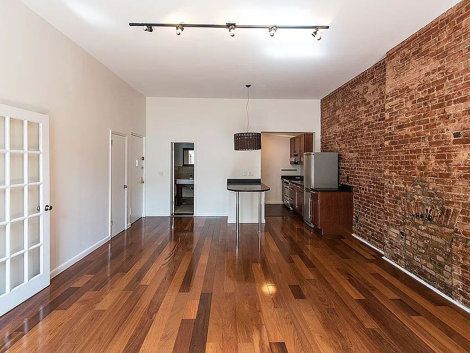 The apartment boasts excellent closet space, including lofted storage in the bedroom, and large French doors connecting the bedroom to the living area. A dramatic full-length exposed brick wall runs floor-to-ceiling, complementing the Brazilian walnut 5" plank hardwood floors throughout.