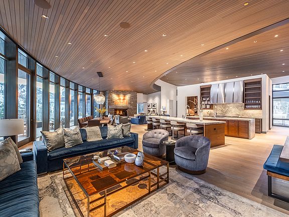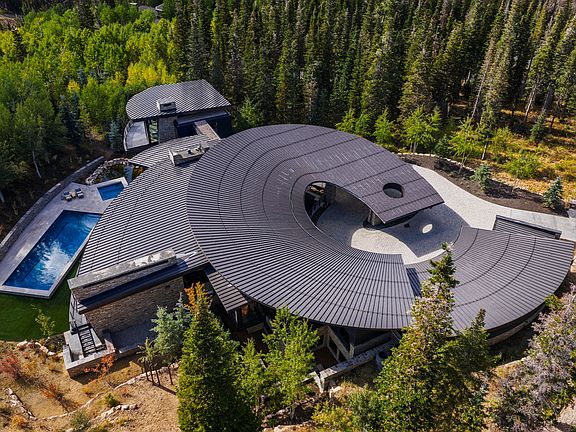 Welcome to Soluna at The Colony-a true architectural landmark envisioned by Michael Upwall and brought to life on one of the most coveted 4.5-acre ski in ski out lots in Park City. With its signature curved silhouette and window-lined bridge entry, the home feels less like a structure and more like a living sculpture, thoughtfully designed to follow the natural topography of the land. Every angle, every room, every moment has purpose, flowing intuitively from private sanctuaries to vibrant gathering spaces. Soaring glass walls frame snow-covered peaks and sun-drenched ridgelines, while the cascading creek just beyond the heated deck provides a serene soundtrack to daily life. From the spa-like primary wing to the entertainer's dream kitchen, home theater, gym, and radiant outdoor terraces & drive, four season pool & spa, the design invites you to move, breathe, and connect with the mountains in every season. The Private Parcel also allows you to gather with friends and family in a surreal serenity. The tree filled parcel also allows for a guest house already intuitively designed by Upwall Design.