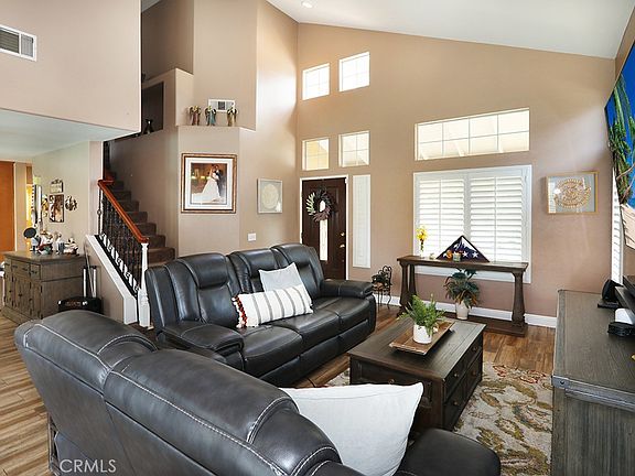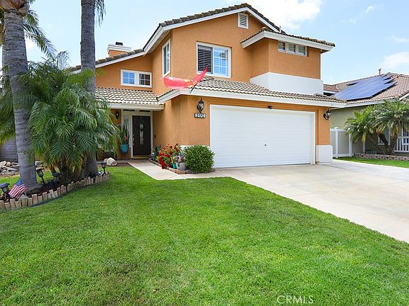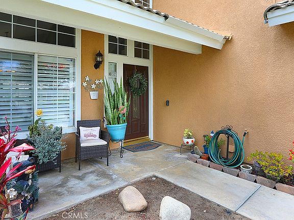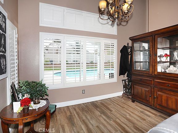 Live the California Dream just in time for summer at this charming 3 bed 2.5 bath pool home in the heart of Corona! Improved in all the right places, this welcoming home features updated wood style tile flooring, custom baseboards, plantation shutters, a beautifully updated kitchen and the perfect entertaining backyard! Step inside the formal living room and dining room with vaulted ceilings and plentiful windows offering an abundance of natural light. The eat in kitchen area features a cozy gas fireplace trimmed in modern tile, and is open to the remodeled kitchen with warm wood custom cabinetry, granite counters with mosaic tile backsplash, stainless steel appliances and recessed lighting. A remodeled powder room with custom vanity completes the downstairs. A newer wrought iron banister leads you upstairs to the primary suite with vaulted ceiling and ceiling fan, walk in closet with custom cabinets and a primary bath with dual vanities and shower bath. Two ample sized guest bedrooms with ceiling fans and slider closets share a guest bath with single vanity. Escape to the backyard for year round outdoor entertaining! Beautifully and privately enclosed with newer vinyl fencing and retaining wall, the yard features raised garden beds with drought friendly landscape, a covered patio with pull down shades, perfect for dining al-fresco, a sparkling pool, a large grassy play area and a paved side yard with storage shed which could also be used for RV parking. Other improvements include a newer AC unit, water heater and leased solar. Fantastic neighborhood with no HOA and lower taxes and conveniently close to the 91 and 15 freeways make this home a highly desirable find you don’t want to miss!