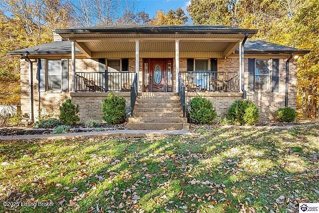 Find your perfect escape in the gorgeous Knobs region of Nelson County. This lovely brick ranch home sits in a peaceful serene setting with a view of open farmland to the front and woods to the rear. Convenient to Bardstown, Elizabethtown and Louisville, this home enjoys complete seclusion, tucked away from the road and surrounded by nature. The home features an open concept great room with a vaulted ceiling and fireplace (with stove insert), a country kitchen with a dining area, custom hickory cabinets, and an island and modern appliances, Hickory hardwood floors on main level (except kitchen, baths & ldry). Primary bedroom is an en suite with double tray ceiling. This well-maintained home has French doors leading to a covered deck that overlooks the wooded acreage with its abundant wildlife (deer, turkey, birds & squirrels). The basement features a large garage, finished bonus room, lots of storage and a safe room with potential additional bedroom or an en suite. Det 3 car garage, and a spacious shed with electricity with another shed for lawn equipment and firewood. One yr HSA Home Warranty. Ready for new owners.