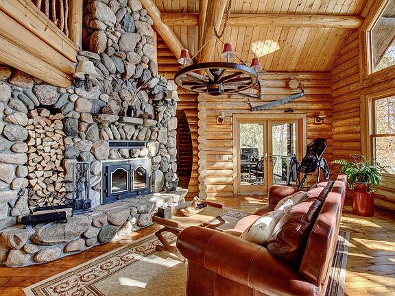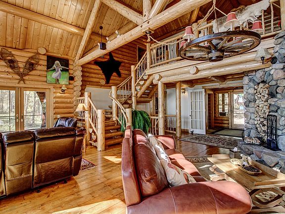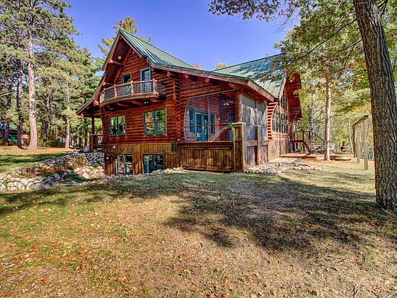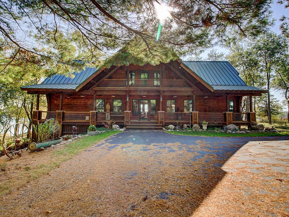 Stunning custom-built Montana log home nestled at the end of a newly paved driveway with 450’ of south-facing, sandy shoreline on Big Stony Lake. This impressive residence offers 5 bedrooms, 5 bathrooms, a striking dual-sided stone fireplace, and a gourmet kitchen designed for entertaining. Enjoy two fully enclosed screen porches and a complete separate living space on the lower walkout level. The property also includes two outbuildings, one featuring a spacious, heated workshop. Surrounded by towering pines and offering exceptional privacy, this retreat truly leaves nothing to be desired.
