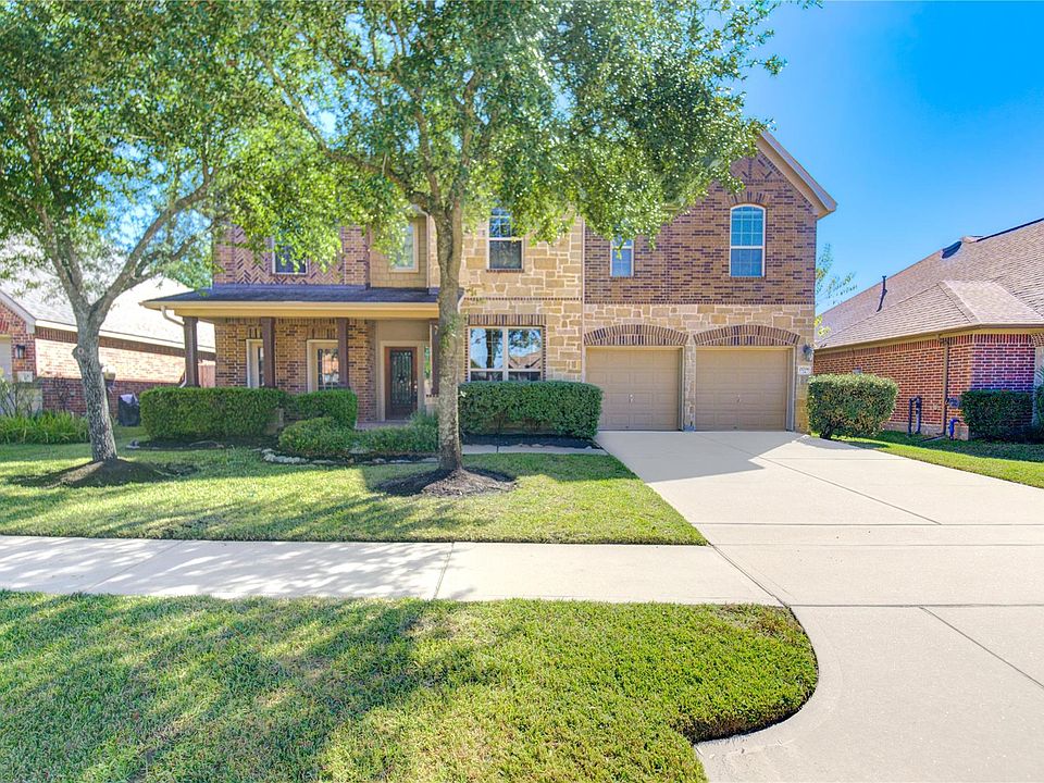 Stunning 5-bedroom, 3.5-bath home featuring a picture-perfect front porch framed by a striking stone elevation. Step into a spacious foyer with a formal dining room and a study/living room. The light-filled family room offers walls of windows, a cozy fireplace, and seamless flow into the chef’s kitchen with granite countertops, stainless steel appliances, a large island, and a sunny breakfast nook. The open layout includes a dramatic two-story living area with soaring ceilings, tons of windows, and abundant natural light. The large primary suite includes an ensuite bath with a soaking tub, separate shower, and a huge walk-in closet with built-ins. Upstairs features a generous game room and four additional bedrooms. The private backyard offers unmatched seclusion with no rear neighbors and a sprawling covered deck with fans—perfect for year-round entertaining. Prime location near the Grand Parkway, I-45, and The Woodlands. Low tax rate and zoned to highly rated Klein ISD.