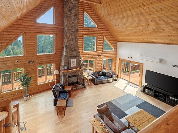 The great room showcases soaring 28-foot ceilings with a striking rock fireplace as its centerpiece, complemented by finished log accents sourced from the property itself. Expansive windows and a wraparound deck invite you to take in the breathtaking views of the surrounding valley and peaks.