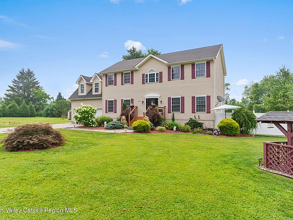Step into timeless charm with this elegant center hall colonial. From the inviting front porch to the generous entryway, every detail welcomes you with warmth and sophistication. The spacious open foyer unveils 2,484 sq ft of beautifully appointed living space, where rich hardwood floors and a thoughtfully designed layout set the stage. Perfect for hosting, the formal dining and living room offer refined spaces for memorable gatherings. At the heart of the home, an expansive open-concept kitchen features sleek quartz countertops, subway tile backsplash, stainless steel appliances, a breakfast bar, and ample room for casual dining. A seamless indoor-outdoor experience unfolds through french doors that lead to a generous deck, ideal for summer evenings and weekend entertaining. A convenient half bath completes the main level. Upstairs, the primary suite is your private retreat, boasting a walk-in closet, dedicated dressing room, and a spa-inspired ensuite with a soaking tub and separate shower. Three additional bedrooms and a full hall bath ensure plenty of space for family and guests. Laundry is thoughtfully positioned on the second floor, just where you need it. A thoughtfully designed extra room offers endless possibilities to create a serene studio, a vibrant playroom, or a personalized workspace. The fully finished lower level expands your options even further, ready for a gym, game room, or secondary family room. Additional features include a two-car garage and beautifully landscaped yard featuring lush gardens, mature trees, and a serene koi pond. Enjoy peace of mind with a range of thoughtful upgrades, including: new roof, modernized kitchen featuring sleek and contemporary finishes, fresh interior paint throughout for a bright, inviting atmosphere, split-units offering both heating and cooling, blacktop driveway for easy maintenance and curb appeal, durable epoxy flooring in the garage and lower level for a clean and modern look, fully fenced backyard offering privacy and storage shed for tools, equipment, or seasonal items. Ideally situated just minutes from the vibrant communities of Saugerties and Woodstock, this home places you at the heart of the Hudson Valley's charm. Discover a variety of nearby attractions, including historic sites, art galleries, local eateries, farmers markets, parks, and unique shops. Nature lovers will appreciate the tranquility of Falling Water Preserve, where cascading waterfalls and wooded trails line the Hudson River, and the Esopus Bend Nature Preserve, offering scenic hiking paths perfect for outdoor adventures. Only 2 hours from Metro NY, this move-in ready gem blends classic style with modern comfort, offering a peaceful sanctuary to call your own.
