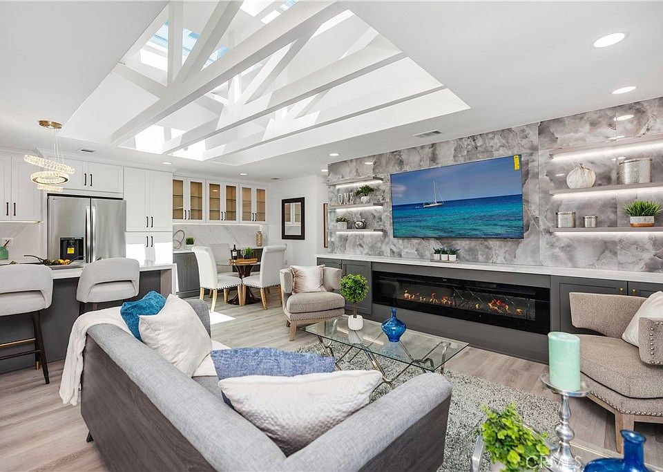 YOU WILL NOT WANT TO MISS SEEING THIS COMPLETELY REMODELED "CASA LINDA" CONDO REMODEL! A COMPLETE DESIGNER REMODEL with a bright open concept great room, dramatic skylights with architectural beams, and a striking feature wall with a linear electric fireplace and lighted display shelves. The spacious living and dining areas open to an enclosed sunroom lined with windows and additional skylights, perfect for an office, art studio, or quiet reading lounge. Additionally, there is an inviting open balcony to enjoy fresh air, BBQing, and take in the treetop views. The chef’s kitchen is a showstopper, featuring a waterfall quartz island for casual dining, a full-height slab backsplash, two-tone soft-close shaker cabinetry, under-cabinet lighting, stainless steel appliances, and a built-in buffet with glass-fronted uppers. Both bedrooms are generous. The primary suite features mirrored wardrobes, custom built-in cabinets, and a skylight with architectural beams. At the same time, the guest bedroom boasts recessed lighting, access to the balcony, and a sunroom retreat.  Two beautifully updated bathrooms feature a dual-sink vanity, lighted mirrors, and large walk-in showers, one of which includes a bench and rain shower head. EXTRAS include luxury vinyl plank flooring throughout, recessed LED lighting, smooth ceilings, dual-pane windows and sliders, an inside laundry room with a brand-new stacked washer and dryer, a walk-in pantry, and an assigned carport with storage cabinets. This home boasts excellent curb appeal, is conveniently close to parking, and features a well-located walk-in entrance.