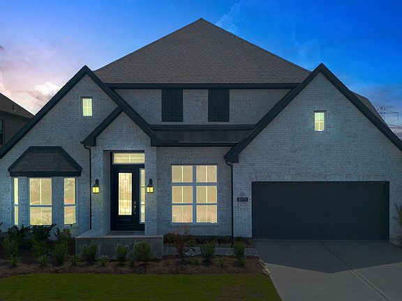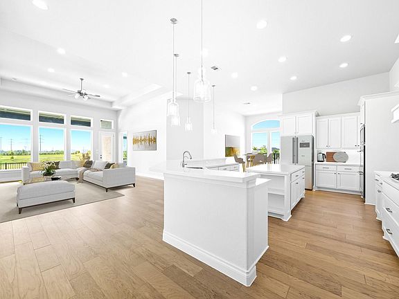 1½-story home features an elegant oval entry with 13' ceilings that open to the formal living room. The extended entry with a 21' ceiling is flanked by formal dining room on one side and kitchen on the opposite side. The kitchen is central to the home and open to the dining room, breakfast room and family room. It features a large island with high bar, 42" cabinets, stainless steel built-in microwave and oven, 36” cooktop, and dishwasher. The large 18'x21' family room features a 14' ceiling, 78" electric fireplace, and large wall of windows. The master bath includes a freestanding tub, separate shower and His and Hers vanities. Located upstairs is a game room, media room, and ½ bath. Home sits on a lot with no back neighbors and a waterfront view.