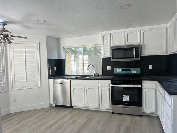 Newly remodelled home on a quiet cul de sac with open floorplan. This home was just finished from when you enter from the new custom wood front door, to the newly designed kitchen with new appliances, new interior doors, new fixtures, new wood laminate floors, smooth ceilings with new LED lighting. All Bathrooms are fully remodelled with new stone counter top vanities, new designer tiled showers and modern fixtures. Two large bedrooms downstairs with a shared bath. Upstairs primary bedroom with large walk-in closet and en-suite bath with dual sink stone top vanity and new designer tiled shower. Two additional upsatirs bedrooms complete the floorplan. Large two car garage with new garage door and very low maintenance backyard and exterior side yards. Home is close to all amenities, schools and neighborhood shopping! Renter is responsible for all utilities. Water, electricity and Gas.
