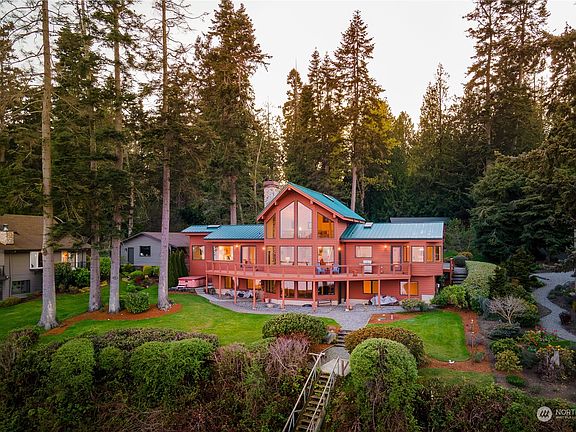 First time offering in over 90 years, a President Pt waterfront property cherished thru generations. Wind thru cedars & firs to this NW Contemporary Lodge Style home! Open & airy with lofty T&G, beamed ceilings in a great room concept, full height stone fireplace & window walls to the sea! All rooms drink in dazzling views of Puget Sound shipping, Cascades, Seattle cityscape & peeks of Mt Rainier. Soothing to the soul! Easy one level living, formal & informal dining, wide view deck for dining alfresco. Updated lower level provides guest space & room for creativity, all with VIEWS! Beach access on your own property to almost a mile of beach to enjoy. Explore tidepools, gather shellfish, launch your kayak, fish. Relax. Live life by the tides!