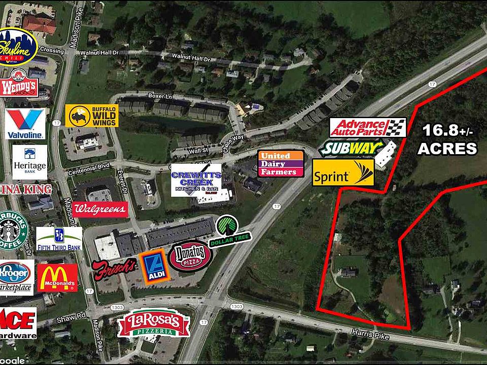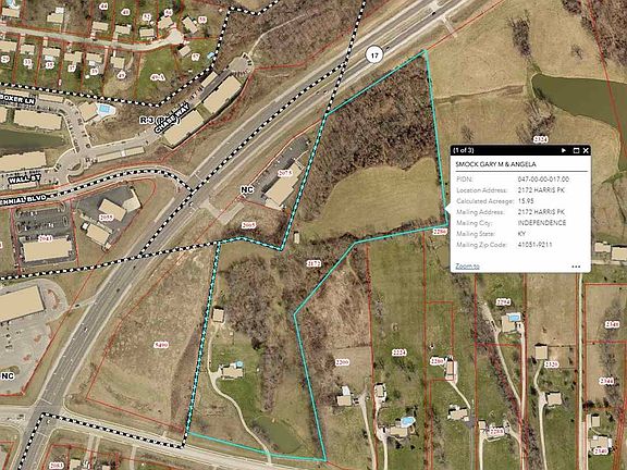 16 +/- Acres at the 4 way Interchange in the Heart of Rapid Growth Area in Independence*Will Require Re-zoning*Excellent Opportunity for Commercial Development/Strip Center/Large Box Store/Possibly Multi Family/Apartment Complex*High Traffic Visual Access on New 17*Access off of Harris Pike/Route 536*Value is in Land (Not House/Outbuildings)*Small Lake on Property could be used for Storm Sewer Drainage*Appears that Water/Sewer are available*Call for Details!