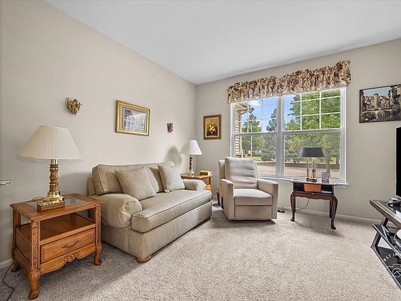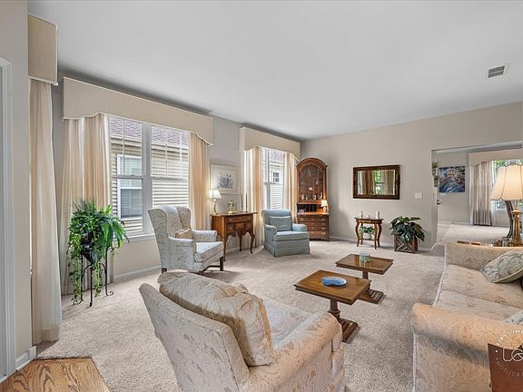 Move in ready custom ranch in the amenity filled "Carillon At Stonegate" set on a quiet cul de sac with open uninterrupted views from the home and the backyard patio. Open floor plan with 9 foot and cathedral ceilings, versatile room uses (ie- the space where you see the dining room is really the family room in the original floor plan and open to the kitchen-there is dining space that can be utilized along side in the living room. The kitchen offers a center island, quartz counter tops, stainless steel appliances, custom cabinetry and is also open to the breakfast room and sunroom. You will love the versatility of the front den, the private primary bedroom suite & bath + a second bedroom with adjacent full bath ALL on one level. Main level laundry center which has direct access to the garage. Recent updates include: Interior paint and carpeting (2023), Luxury vinyl plank flooring in the back hall (2023), Furnace, central air, water heater (2021), & new roof a few years ago. The community clubhouse is the center of the neighborhood including many planned activities, socials, swimming, tennis & pickleball. Minutes from shopping, I-88, downtown Naperville and Aurora. This is one of the premiere 55+ neighborhood communities!.