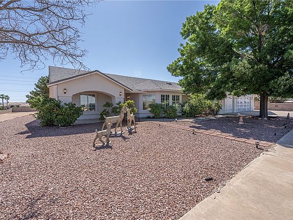 Don't miss this rare find in a prime Kingman location a beautifully & spacious 3-bedroom, 2-bath home sitting on over an acre with a pull-around concrete driveway and mountain views! This property features a massive 7-car pull-through garage complete with a MAXX heater, utility sink, and extra storage room perfect for car enthusiasts, hobbyists, or those needing serious workspace. Inside, you'll find a spacious semi-open layout with a cozy gas log fireplace (with chimney flue for wood-burning flexibility), custom built-in curio cabinet in the living room, and tasteful tile and high-quality laminate plank flooring throughout. The kitchen boasts plenty of cabinetry and counter space, opening into a large dining area, perfect for entertaining. A separate laundry room includes tons of cabinetry, a built-in ironing board, and additional storage. The primary bedroom offers ample space, a huge walk-in closet, and elegant touches like skylights and lighted pot shelves. You'll love the split floor plan, providing added privacy with the spacious primary suite separate from the guest bedrooms. Outside, enjoy a landscaped front yard, mature trees in front and back, vibrant rose bushes, and even a fruiting pomegranate tree. This home is the perfect blend of comfort, function, and space, ideal for anyone looking to enjoy the serene desert lifestyle without sacrificing amenities.