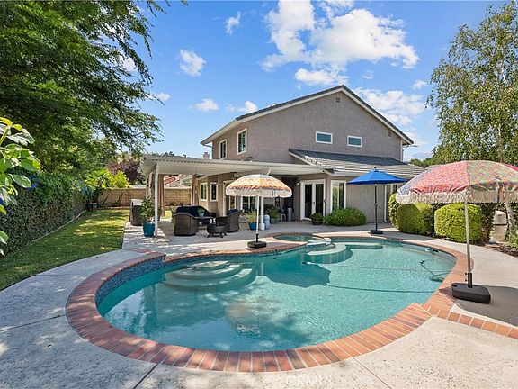 Beautifully Remodeled Brock Canyon Pool Home with OWNED Solar (2020) on a culdesac.. Impeccably maintained 4 bedroom 3 bath offering modern upgrades, energy efficiency coupled with resort-style outdoor living. Featuring a full bedroom and bath on the main floor, this home is perfect for multigenerational living or guest accommodations. Step inside to find luxury vinyl plank (LVP) flooring throughout with decorative baseboards paired with vaulted ceilings, recessed lighting, custom light fixture, ceiling fans, and white wood faux blinds that add a clean, contemporary touch. The remodeled kitchen shines with quartz countertops, stainless steel appliances, and an open layout to the family room, making it ideal for entertaining. The family room features a cozy gas fireplace with heat-producing logs, complete with white bricks and decorative paneling. While the dual-pane windows, French doors and sliders (all replaced in 2020) seamlessly connect indoor living to your private backyard oasis. Enjoy year-round outdoor dining under the new patio cover, or relax in the pool and spa, updated with a new heater and filter in 2024, boasting lush landscaping, large grass area and lots of privacy! The formal dine is situated perfectly between the kitchen and living room and allows for access to the covered patio. Upstairs, the spacious main suite boasts vaulted ceilings, a double-door entry, custom closet organizer, and a remodeled en-suite bathroom with a deep soaking tub, dual sinks, and stylish vanity. The secondary bedrooms are well designed and have ceiling fans, All bathrooms have been tastefully updated with high-end finishes. The closets features custom shelving for maximum organization. Additional highlights include: Tesla Back Up Battery, New garage door and opener (2024), Cabinetry and shelving in the garage, Copper Plumbing, Roof 2023, Rain Gutters 2024, HVAC/Heater 2023 and Mirrored Wardrobes. The minute you walk in you feel the warmth and love! This home has been thoughtfully upgraded throughout. It’s truly move-in ready and a must-see for anyone seeking comfort and quality! Welcome Home!