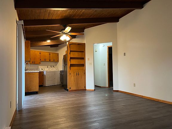 Has beautiful open beam vaulted wood ceilings in Living room, Kitchen, and both bedrooms.