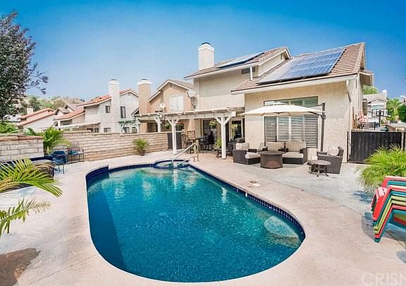 You won't want to miss this stunning Saugus POOL home!!! The sellers have updated this property throughout. The kitchen has been remodeled with quartz counters, stone backsplash, a copper sink, refinished cabinets and black stainless steel appliances. The kitchen is open to the family room with a custom stone accent wall and wood mantle. Downstairs also offers a large dining area with custom lighting, a large living room, a darling half bath and laundry room. Wood stairs lead up to 4 spacious bedrooms, 2 bathrooms and a tech niche perfect for a home office or home school area. The master bedroom has vaulted ceilings and a large bathroom with dual sinks and tile flooring. Other upgrades include plantation shutters , stained concrete flooring, ceiling fans and neutral paint tones throughout. The backyard offers a beautiful sparkling pool and spa and a covered patio. The pool has newer LED lights and newer variable speed pump. Plus solar to help keep electric bills down. Attached 2 car garage with cabinets and overhead storage. Located on a flat cul-de-sac with no rear neighbors. No Mello Roos and low HOA. This one is a winner!!!