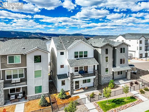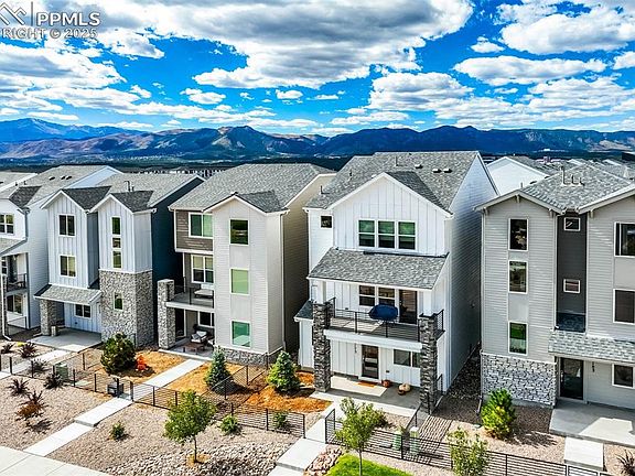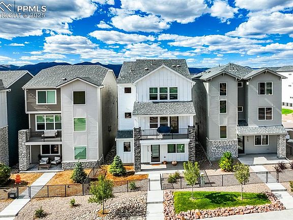 Enjoy Colorado living at its best in this thoughtfully designed three-level home with Pikes Peak views you will never get tired of and upgrades throughout. The main floor is the true centerpiece, featuring a dramatic two-story entry that leads into a bright, open layout. Cook and entertain with ease in the gourmet kitchen, complete with a spacious island, prep kitchen with butler’s pantry, and adjoining dining area that extends to a covered deck. A deck with breath taking views of Front range - your morning coffee experience will never be the same again. The great room flows seamlessly, creating the perfect setting for gatherings or quiet evenings at home. Upstairs, retreat to a luxurious primary suite with spacious bath and walk-in closet. Two additional bedrooms, a full hall bath, and a convenient laundry room round out the upper level. The entry level offers incredible versatility with a private guest suite and bath, office/flex space, and mudroom, all with direct access to the two-car garage. Modern finishes elevate every corner, black iron railings, upgraded doors, granite counters, a gas range with griddle, custom built-ins, marble tile in the primary bath, and a cozy electric fireplace. Smart features pre-wires will make set up easy for solar panels and EV charger to ensure convenience and efficiency. This home balances elegance and function, ready to welcome you with space for every chapter of life.