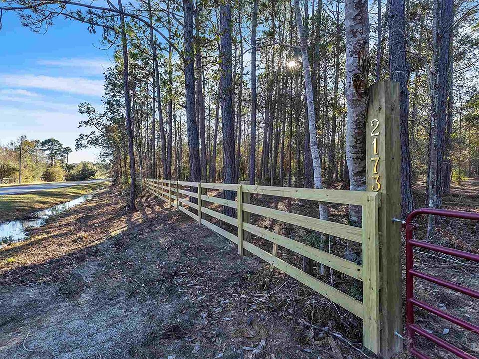 Build your dream home on over 20 acres of private wooded land. Wetland study has been completed and available on request. The land is approximately 20 feet above sea level. Permit for septic tank has been initiated. 5000 sf barndominium plans are available and a 40x96 pole barn - large enough for 8 pieces of farm equipment- is on site and ready to be assembled. The property is close to I-10 and only minutes to Gulf Breeze. It is equipped with a water meter and electric access.