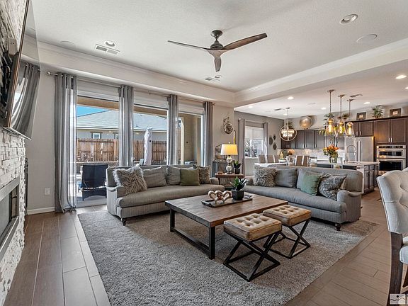 This immaculate like-new Toll Brothers masterpiece is placed within the prestigious guard-gated Presidio at Damonte Ranch. The property exudes timeless elegance with modern conveniences. Outdoor entertaining areas in the front and backyard have TV mounts, gas fire pits, heaters, extra storage, bar, and lighting. The fourth bedroom has its own entrance, full bath, and can be used as mother in-law quarters., Upgrades include extra large driveway which fits 4 cars, porcelain tile flooring, cushioned living room carpet, wall sconces, granite counter tops, wine refrigerator, additional cabinets, built in shelves, stone fireplace, insulated garage with epoxy flooring and 220 volt outlet, recirculating hot water, sound system throughout, custom landscaping with privacy wall, Phantom screens, and closet-by-design closets in the master.