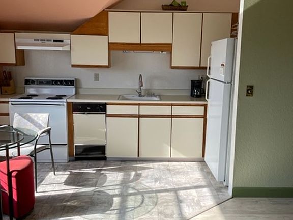 This upstairs studio features wood flooring throughout and comes with furniture such as a queen size bed, a dresser, a nightstand, a chair, a glass dining room table for two, a television, and a desk. Kitchen is equipped with a fridge, stove/oven, a coffee pot, dishes, and pots and pans. Bathroom has a shower/tub combo, a vanity, and a mirrored medicine cabinet.