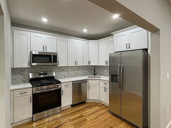 Stunning fully renovated attached brick home in the heart of Cambria Heights! This modern residence features 3 bedrooms and 2 full bathrooms, high ceilings, recessed lighting, and gleaming hardwood floors throughout. The brand-new kitchen boasts quartz countertops, stainless-steel appliances, and abundant cabinetry. A finished basement offers versatile space with direct access to the rear driveway and attached garage. Ideally located near shops, schools, and transportation, this home combines style, comfort, and move-in-ready convenience in a prime Queens location