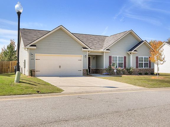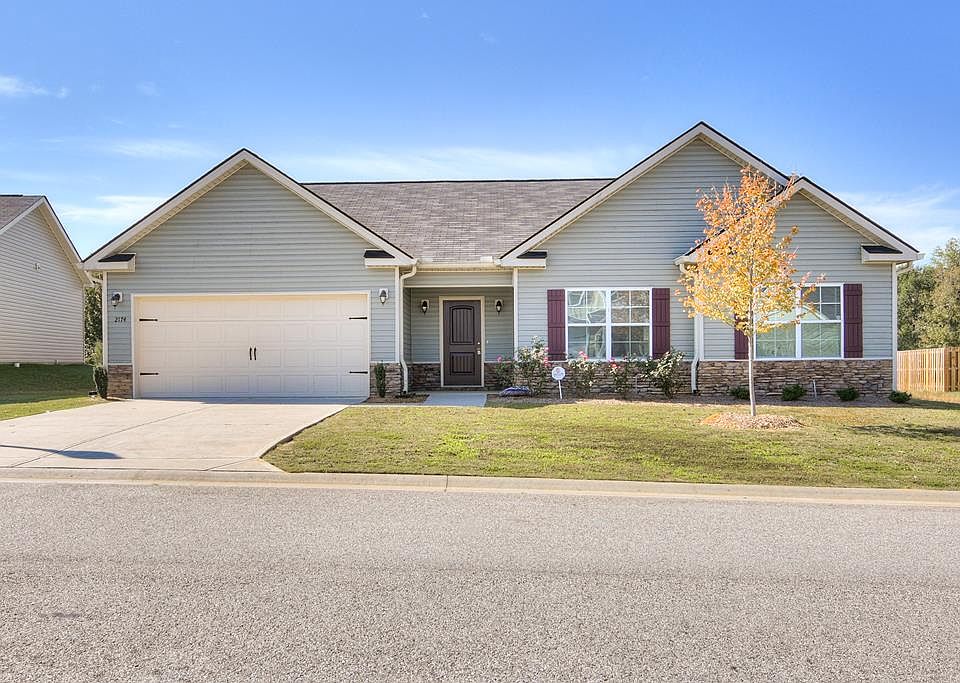 Practically brand new ranch home in Grove Landing! Beautiful stone facade sets the stage for the interior of this home! Foyer opens to the spacious, great room with vaulted ceiling and luxury vinyl plank flooring. Kitchen with stainless steel appliances, granite counters, island, good-sized pantry and shaker style, beadboard cabinets and eat-in area. Owner's suite complete with trey ceiling and en-suite with double vanity, separate shower and garden tub. 2 additional bedrooms with a full bath. If you enjoy time outdoors you will love this backyard space...covered patio and large fenced in yard, ready to be turned into your ideal outdoor space!