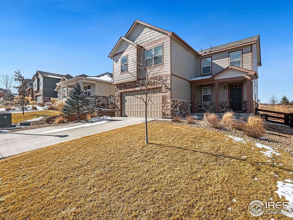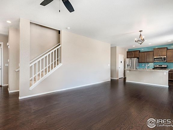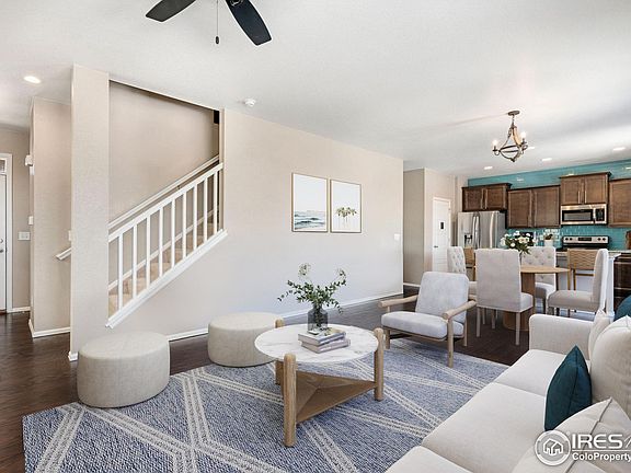 Enjoy all of the amenities that beautiful Water Valley has to offer! Walking and biking trails, and lakes and ponds make for resort style daily living. The comfortable floor plan includes a charming kitchen with granite counters and espresso cabinetry as well as a huge walk-in pantry and breakfast bar. Tasteful finishes include wood flooring throughout the main level and a cozy gas fireplace with floor to ceiling stacked stone, perfect for chilly Colorado nights. All bedrooms and laundry room are on the second level and the primary suite is an oversized sanctuary with a separate sitting room and an ensuite with walk-in closet. The basement provides additional room to expand! The back yard is privately tucked behind a grassy berm and is fully landscaped and complete with a pet-ready fence. Garage is equipped with a NEMA 1450 plug for electric vehicles and ceiling fans have been added throughout the home. Ride your golf cart to Pelican Lakes or Raindance National Golf Club, play, and dine just moments from your doorstep. Turnkey home ready for its new owner!
