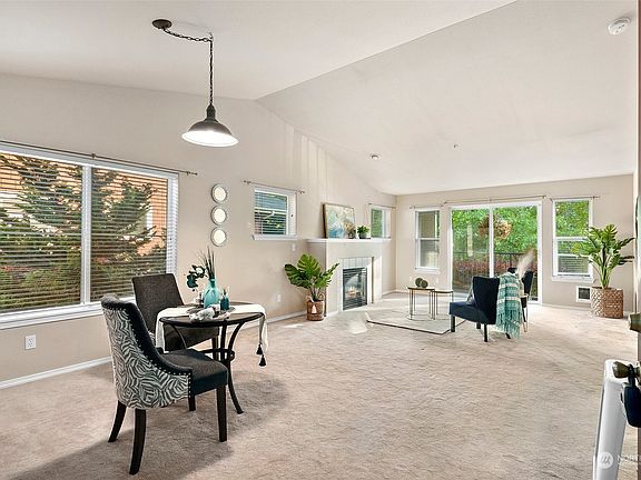 Fabulous second story condo in prime Dupont location! Vaulted ceilings and large windows create a light and bright open concept living space. Gas fireplace; recessed lighting. White, crown molding topped cabinetry in Kitchen. Tiered peninsular counter with eating bar. All appliances stay! Primary Suite completed with walk-in closet and private bath with walk-in closet. Two guest bedrooms plus full guest bath. Laundry room in unit! Enjoy your morning coffee or evening beverage on covered deck. Over-sized garage for parking or additional storage space. Sports fields, trails, golf course - this neighborhood has it all! Mere minutes from JBLM main access & I5 for commuting. Move-in ready - all it needs is you!