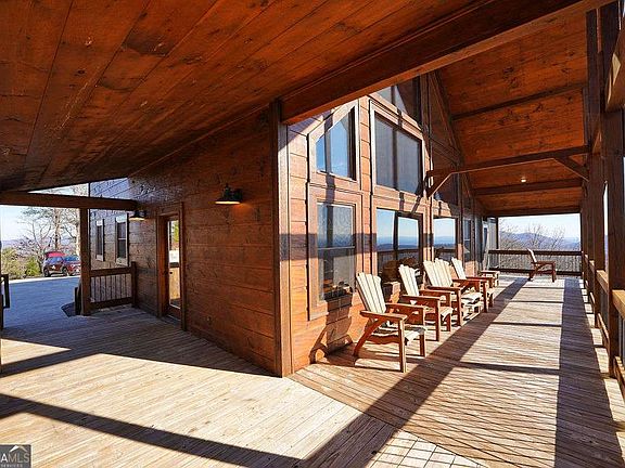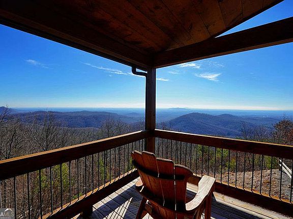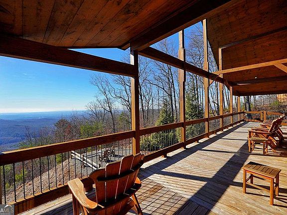 BIG UNOBSTRUCTED PANORAMIC VIEWS define this furnished three-level rustic cabin in the North Georgia Mountains. Approximately 270-degree mountain views wrap around the home, featuring long-range, unobstructed vistas along with some seasonal mountain views. A custom-designed rustic cabin welcomes you with hand-hewn-style siding and thoughtful craftsmanship throughout. More than 2,000 square feet of expansive decking creates exceptional outdoor living space, purposefully designed to capture and maximize the surrounding mountain scenery. Inside, an open floor plan immediately draws attention to a dramatic wall of windows soaring to the cathedral ceiling, perfectly framing the breathtaking views while filling the home with natural light. The main living area features a masonry-style gas log fireplace, rustic architectural accents, and a well-appointed kitchen with granite countertops. The first primary bedroom is located on the main level and includes a large walk-in closet and an attached full bathroom with a conveniently located washer and dryer. Just off the main level is a 352 sq ft enclosed porch with a second gas log fireplace and stone facade, offering extended seasonal use. The upper level features a cozy loft ideal for relaxing or office space, along with the second primary bedroom featuring cathedral ceilings, a large walk-in closet, dual vanities, a walk-in shower, and a full bathroom. The lower level provides excellent flexibility with a recreation room featuring the home's third gas fireplace and wet bar, along with a spacious bedroom and full bathroom. Walkout access opens to an entertainment deck, hot tub, and a large graveled outdoor area, all with long-range mountain views. The home is offered furnished, with most contents conveying; exclusions apply, allowing for immediate enjoyment as a primary residence, second home, or mountain retreat. Rustic finishes, granite countertops, and wide doorways reinforce the cabin's character while maintaining comfortable livability. Additional features include a 1,200-gallon underground reservoir tank, Ever-Sealed decking for low-maintenance and durability, a Generac whole-house generator, and a concrete driveway with ample turnaround space.