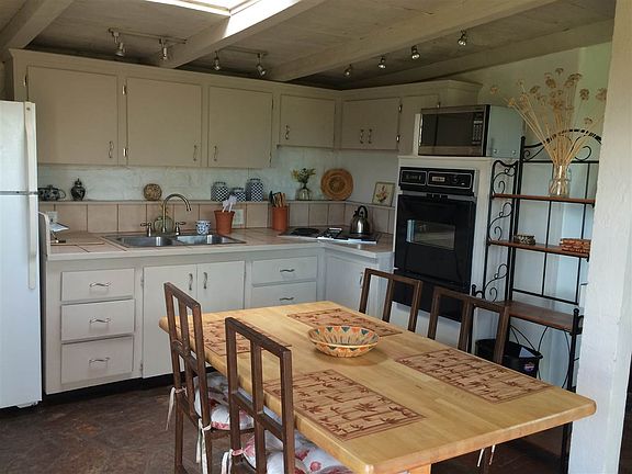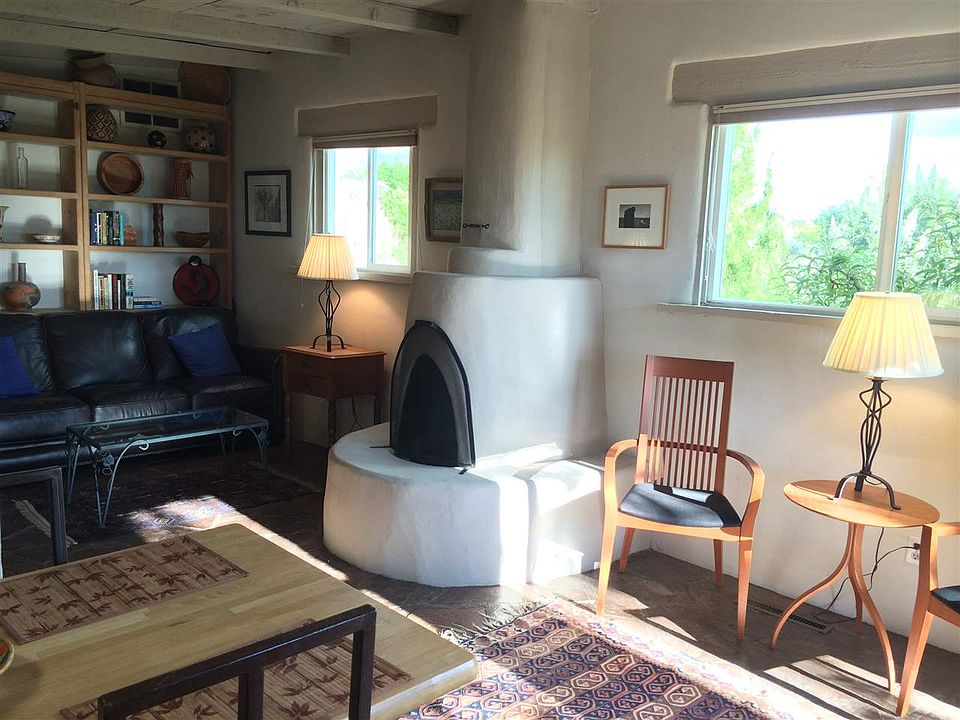 Originally a barn, the mostly adobe FURNISHED home has been converted and expanded. It sits on a hill beside one of the few old style compounds left in Santa Fe. The casita (little house) has its own driveway and parking area, as well as a private garden with native grass, flowers, bushes, and tall trees. There is a small swimming pool in the center of the compound, open in summer. Rent includes WiFi, gas, electric, water, sewer, and garbage pickup. Fully furnished, including bed and bath linens, kitchen equipment, and table ware Flagstone, brick, and Saltillo tile floors Traditional Santa Fe fireplace Skylights and ceiling beams Queen bed and dressing area in bedroom Stacking washer/dryer Bathtub with shower Central forced air heat Outdoor table and chairs for sunny winter days Shed for skis, bicycles, luggage, etc.