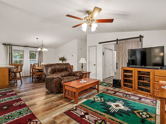 Welcome to a park-like rural property in the North Valley. The property has a forested setting that has been well maintained, thinned out, and well improved. The circle driveway allows for the largest of RV's or trailers to be driven through the property with ease, and there is plenty of useable space upon the level 2.6 acre lot for gardening, raising animals, or even adding a ADU! The 1782 square foot home has beautiful updates-laminate floors throughout, drywall and painting throughout, well lit vaulted spaces, and an office in addition to 4 bedrooms as well as 3 full bathrooms. The home, and all its modern amenities, is complimented by a large detached garage. It has a two car door with space for more storage or a workshop. Come take a tour!
