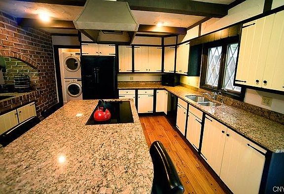 Beautifully maintained tudor home located on the east side of Otisco Lake in Marcellus School District! This unique home constructed of brick and cedar exudes character inside and out. Exposed beams, brick archways and hardwoods in throughout the first floor. The fully updated kitchen with granite counter tops and new appliances faces a woodstove and fireplace in the great room. An attached two car garage and shed provide plenty of room for storage and access to the house and basement. The secluded 4.9 acre lot with views of Otisco Lake is the perfect place to relax or entertain on the front or back patio. The back yard has a barn and pasture equipt with running water and electric for horses and a small fruit orchard. This home is truly one of a kind and a must see!