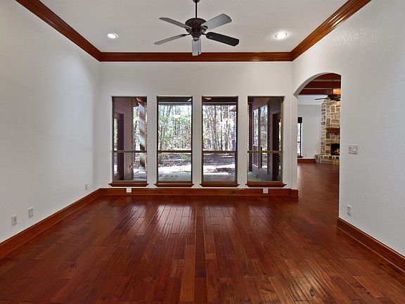 Discover the natural beauty and modern luxury of this 4-bedroom, 3-bathroom home just blocks from the stunning Lake Palestine. Offering 2,876 square feet of thoughtfully designed living space, this property is nestled on a picturesque 1.148-acre wooded lot, providing privacy, comfort, and elegance at every turn. The subdivision boasts custom-built homes, ensuring no two are alike. Enter through a striking dark wood front door into a secondary formal dining room. Nearby, the formal dining room is perfect for hosting memorable meals and celebrations. An office with a closet offers a productive work environment and can efficiently function as a fourth bedroom. The main living room, featuring a cozy gas log fireplace and a built-in desk, flows seamlessly into a chef’s kitchen. Designed for gatherings and everyday convenience, this kitchen boasts a large island, breakfast bar, gas stove, built-in electric oven and microwave, and a walk-in pantry. Retreat to the master suite, with high ceilings and access to the back patio. The en-suite bathroom is a spa-like escape, with a soaking tub, walk-in shower, dual vanities, and separate walk-in closets. The home’s split floor plan ensures privacy for all, with two bedrooms connected by a Jack-and-Jill bathroom, each with a sink and vanity. An additional bathroom is ideal for guests. The entire house is 100% handicapped accessible, offering easy mobility throughout. The laundry room includes a sink and abundant storage, while modern upgrades like a tankless water heater, triple-pane windows, a 250-gallon propane tank, and a dual-zone air conditioning system enhance comfort and efficiency year-round. Step outside to a covered patio with a ceiling fan, perfect for enjoying the serene wooded setting. The proximity to Lake Palestine includes access to a nearby small marina, ideal for outdoor enthusiasts. Blending natural tranquility with nearby outdoor recreation, this property is an ideal retreat.
