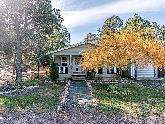 Discover this top-of-the-line Palm Harbor home in the serene community of Overgaard, AZ, offering 2 bedrooms, 2 bathrooms, and a versatile den with kitchenette. Nestled on a generously sized 12,000 sq ft lot adorned with tall pine trees, this residence invites you to enjoy nature at its finest. Enter through a welcoming front deck into a spacious living area featuring an electric fireplace. The spacious kitchen impresses with tile and copper inlays, perfect for culinary enthusiasts. Entertain guests at the outdoor bar or unwind in the tranquil hot tub. Additional storage is available in the 1-car garage. Upgraded 2''x6'' framing & concrete siding. Tour today to experience this exceptional property!