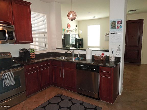 Charming neighborhood, pool and parks just steps away. Home features granite counters in kitchen, 3 bedroom, 3 full baths. Large master suite with large walk-in closet, and 2 additional spacious bedrooms upstairs. Teen room, and great room, Large Hallway upstairs with niche easily fits computer table and chair, tile in all the right areas, blinds, fans. Laundry room upstairs (W/D not included). Nice patio and play area for children or BBQ. Close to shopping centers and easy access to 202. Community amenities offer basketball courts, 2 swimming pools,volleyball, children play areas and greenbelts. Utilities not included. No yard care. No pets allowed. Within a mile of Target, Gateway airport, Gilbert Emer Hospital, many restaurants, Golf, etc. Elementary School right around the corner...Gateway Pointe.