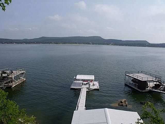 3BR, 2BA lake front house with easy-care landscape featuring lake country scenery. Light and airy feel, ample storage space, modern white kitchen. Central heat and air. Balcony with a beautiful lake view, large oak trees. Enjoy a friendly atmosphere! Attractive lifestyle boasting a deep water covered swim dock and boat rail system. Deeded Property!