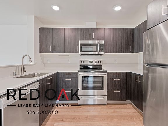 Spacious and Welcoming One Bedroom with Protected Private Balcony, Wonderful Amenities, Walk-In Closet, Stainless Steel Appliances, Parking, and In-Unit Washer/Dryer Included ~ In Prime Rampart Village! Multiple Units Available ~ Pricing May Vary Based on Floor Plan and Availability Welcome to Your Exclusive Haven of Convenience: Step into a new era of luxury living at Lux Los Angeles, a recently constructed retreat nestled in the heart of the San Fernando Valley. Experience an unparalleled blend of modern amenities and timeless sophistication that sets a new standard for residential excellence. Revel in a space filled with natural light streaming through expansive windows, and embrace the convenience of brand-new stainless steel appliances, Grohe plumbing fixtures, in-unit laundry, and expansive balconies*. With multiple units available, explore diverse floor plans and price points to find your perfect match. Elegant One-Bedroom Sanctuary: Retreat to a chic one-bedroom hideaway featuring stunning hardwood vinyl floors bathed in natural light from generous windows. Enhanced by contemporary recessed lighting, stay cozy year-round with central heating and air conditioning. The open layout seamlessly connects the living, dining, and kitchen spaces for effortless living. Serene Balcony Escape: Step onto your private balcony through sliding glass doors, offering a sheltered haven with refreshing breezes and picturesque views to elevate your everyday experience. Culinary Excellence in the Gourmet Kitchen: Indulge your culinary passions in a gourmet kitchen boasting new stainless steel appliances, abundant hardwood cabinets, exquisite quartz counters, and a stylish backsplash. A spacious breakfast bar invites casual dining and entertaining. Tranquil Bedroom Retreat: Relax in the cozy bedroom adorned with a sunny window illuminating the beautiful hardwood vinyl floor. Featuring a walk-in closet with custom built-in organizers, enjoy effortless storage solutions for a clutter-free space. Luxurious Spa-like Experience: Pamper yourself in the luxurious bathroom retreat, showcasing a large soaking tub and shower combination with built-in shelving, a generous vanity with extra cabinet storage, and a well-lit, generously sized mirror. Simplified Living Convenience: Experience the ease of having your own washer/dryer for effortless laundry routines. Secure Parking Privilege: Relish the assurance of a designated parking spot in a well-maintained lot for your personal vehicle if you have one, complete with EV spaces for electric and hybrid vehicles. Premier Community Amenities: Lux Los Angeles offers an array of premier amenities, including a captivating cabana-lined sun deck with panoramic views of the Hollywood sign, an outdoor yoga deck, a state-of-the-art fitness center, and recreational spaces. Beautifully landscaped walking paths with a designated dog run provide a tranquil escape, while an online tenant portal simplifies rent payments and maintenance requests. Ideal Locale for an Elevated Lifestyle: Conveniently situated near Shatto Park Recreation Center, diverse businesses, and dining establishments, Lux Los Angeles offers an ideal locale for a vibrant and luxurious lifestyle. Come home to Luxury Living! Available for an immediate move-in. LEASE TERMS: One Year Lease Pictures and descriptions are of EXACT unit Square Footage is approximate. Showings may not be 1-on-1. All information must be validated on Red Oaks Website since 3rd party websites can feed incorrect information.