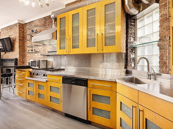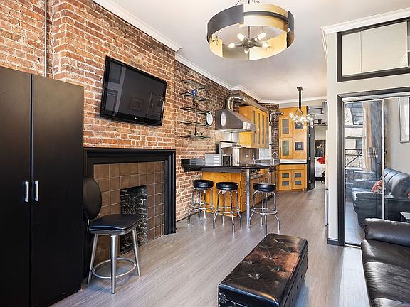 The generous living area features 6’ windows which flood the room with natural light and frame city views. Other highlights include exposed brick, crown molding and a decorative fireplace.