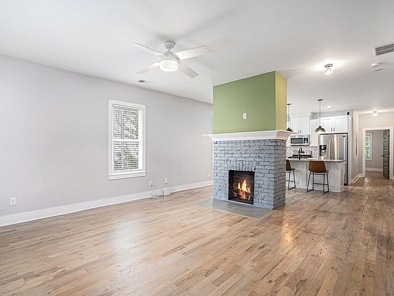 Show-stopping fireplaceOpen-concept livingIsland with pendant lightingCrisp white shaker cabinetryQuartz countertopsTwo fully remodeled bathsGas range
