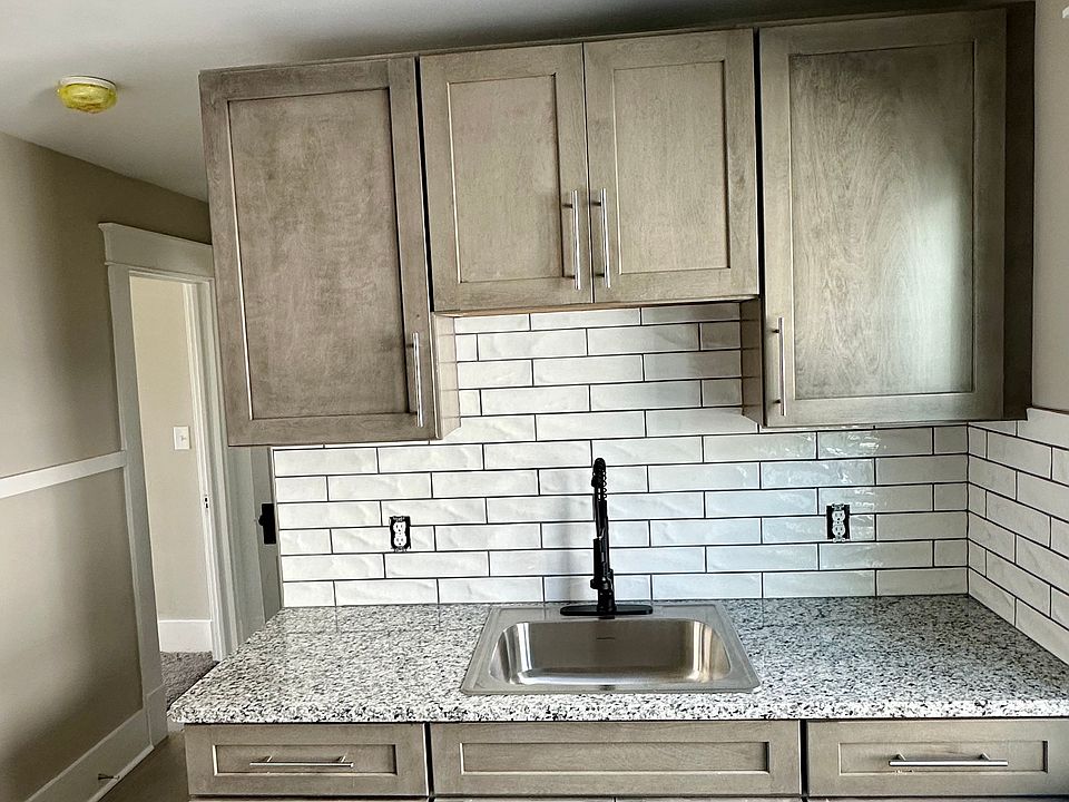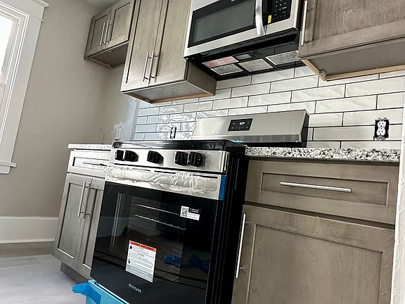 Brand-new kitchen with granite countertops, tile backsplash, NEW cabinets, and NEW appliances (gas stove, refrigerator, microwave)