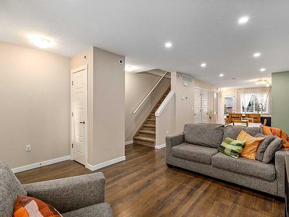 Welcome to this stylish townhome in Redstone offering over 1,600 sq. ft. of finished living space and everyday convenience—including two parking stalls located directly outside your private, fenced yard (a rare find in this complex). Plus, you’re right across the street from shops and moments to parks, pathways, transit, and Stoney Trail. Inside, the main floor is bright and functional with dark laminate flooring throughout. A welcoming front family room features a decent-sized picture window for natural light. The staircase is set along the side of the home beside the central dining area, creating a smooth flow to the back of the house. The rear kitchen is well-designed with dark-stained cabinetry, quartz counters with subtle black and gold veins, subway tile backsplash, stainless steel appliances, a gas stove, an island, and a pantry-style closet. A 2-piece bath is conveniently located across from the kitchen, and the back door leads to your private, fenced yard—perfect for BBQs and easy outdoor living—with those two parking stalls just beyond the gate. Upstairs, laminate continues through the entire upper level (carpet only on the stairs). The primary bedroom includes dual closets and a large nook with a custom built-in for TV and storage, plus a 3-piece ensuite with a corner shower. The second bedroom is generously sized and has access to a full 4-piece bathroom located just outside the door—ideal for guests, kids, or a roommate. The basement is fully finished and adds terrific bonus space: a cozy recreation room with a good-sized window, a 4-piece bathroom, and a rear bedroom with a closet and a bump-out perfect for a TV or desk area. Laundry is downstairs in a dedicated closet, with the mechanical room across. Outside, enjoy the private, fenced yard, and the everyday ease of two assigned stalls right out back—a standout advantage compared to most units with only one. Redstone offers a welcoming, family-friendly vibe with parks, playgrounds, and scenic pathways, plus quick access to shopping, transit, and major routes. Whether you’re a first-time buyer, downsizer, or investor, this home checks all the boxes for space, style, and value. Book your private showing today and experience the best of Redstone living.