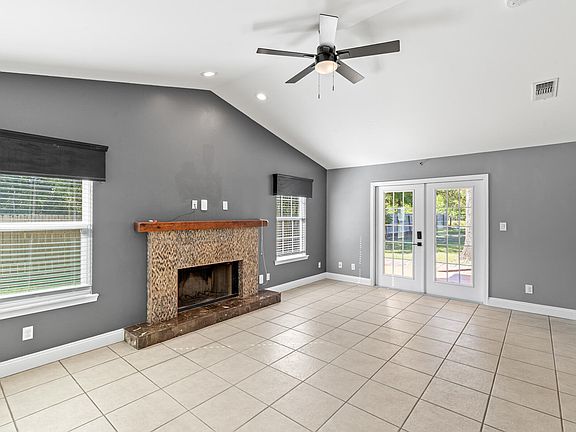 Brick paver patioWood-burning fireplaceSplit floor planVaulted ceilingCeramic tile floorsNew flooringGlass sliders