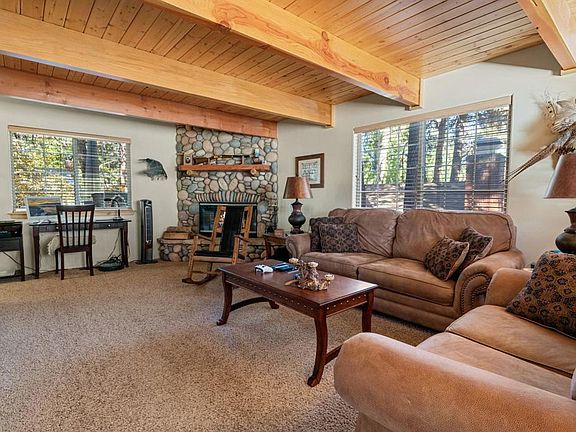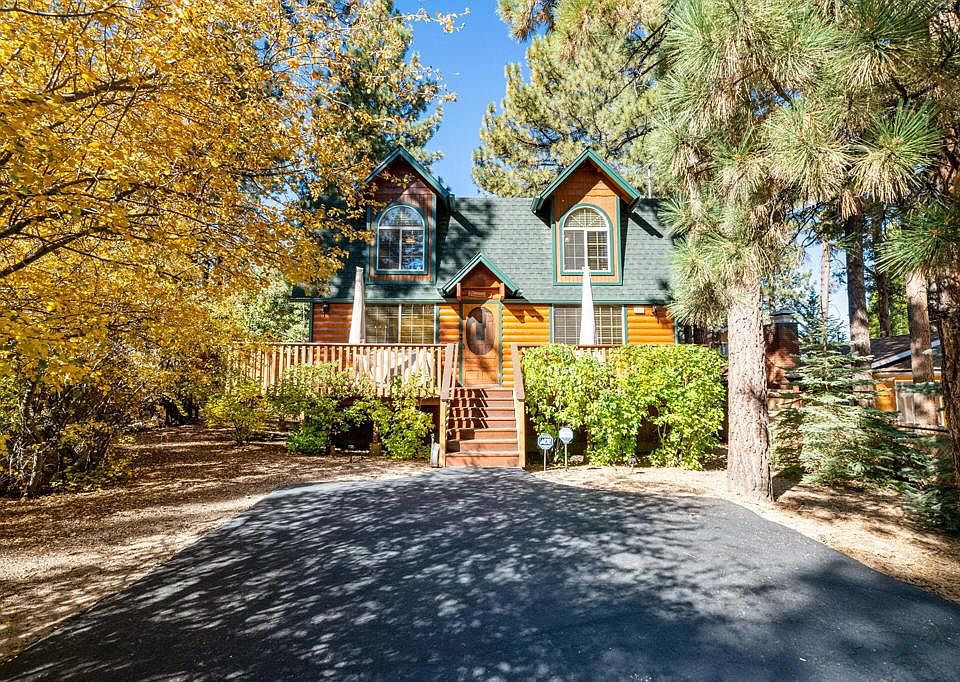 This remarkable log-style gambrel cabin is nestled in its own quiet forest of pine and spruce trees. The completely fenced in, level lot is beautifully landscaped and the home features a wraparound deck from front to back. The main living area is large featuring a cozy rock fireplace for those snowy winter evenings. Beamed, T&G ceilings give the home a nice cabin feel. The kitchen has plenty of room for all your cooking needs. Granite countertops and knotty pine cabinets add to the mountain cabin charm. There is one full bathroom and a laundry area downstairs, upstairs are the 3 bedrooms and another full bath. This home has been meticulously maintained since it was built in 2007...equipped with dual pane windows and forced central heat and A/C. Home was painted and driveway redone within the last 2 years, still looks new! Enjoy all that Sugarloaf and Big Bear Lake have to offer...walking and biking trails, Sugarloaf park with dog park is within walking distance. The two ski resorts, Big Bear Lake and The Village downtown are just a short drive away. This home would be great for full time living through all 4 seasons of Big Bear or any kind of investment property. The home comes furnished, less personals. (exclusion list)